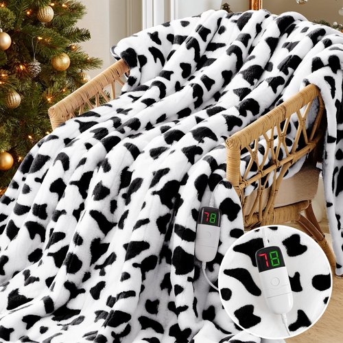 Cow Print Heated Blanket Electric Throw 62x84 Twin Size, Faux Fur Heating Blanket with 10 Heating Levels, Soft Cozy Sherpa Blanket Warmer, Cow Blanket, Plush Fluffy Warming Gift for Couch, Washable