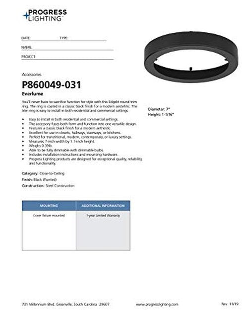 Progress Lighting Everlume Collection Black 7" Edgelit Round Trim Ring, 1 Count (Pack of 1)