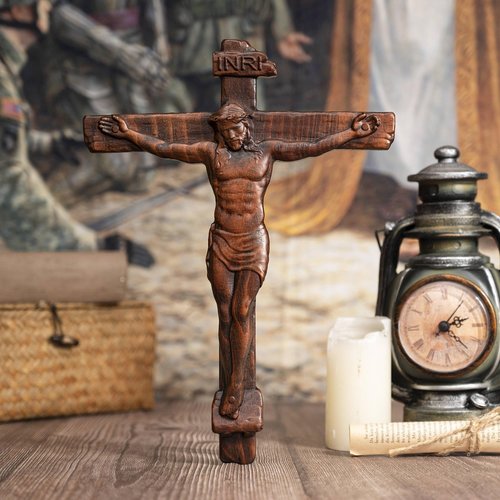BGCOPPER Wooden Crucifix Wall Cross, INRI Jesus Cross for Wall, Handmade Cross Wall Decor for Home Christmas Gift - 14 Inch