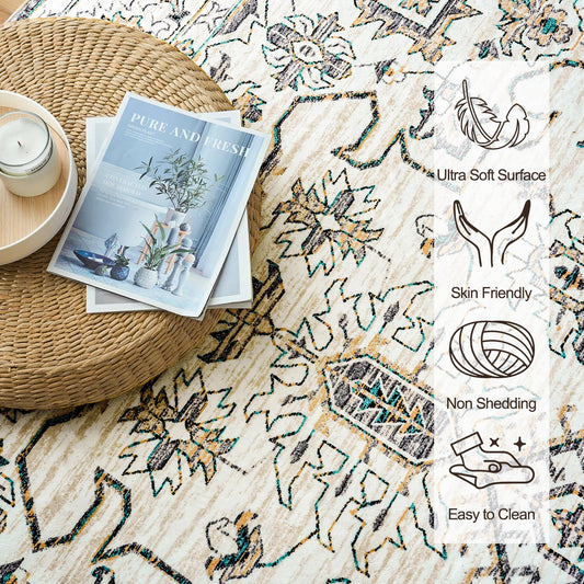 VK VK·LIVING Machine Washable Rug 5'x7' Vintage Design Washable Area Rugs 5'x7' Area Rug with Non Slip Rugs for Living Room Bedroom Rug Carpet Stain Resistant, Home Decor Office Boho Rug, (Beige)