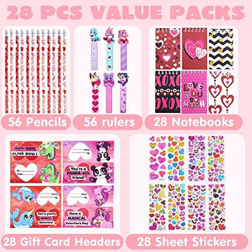 JOYIN 28 Packs Valentine's Day Stationery Set with Gift Card for Kids, Includes Pencils, Rulers, Notebook and Stickers for Classroom Exchange Party Favors Supplies
