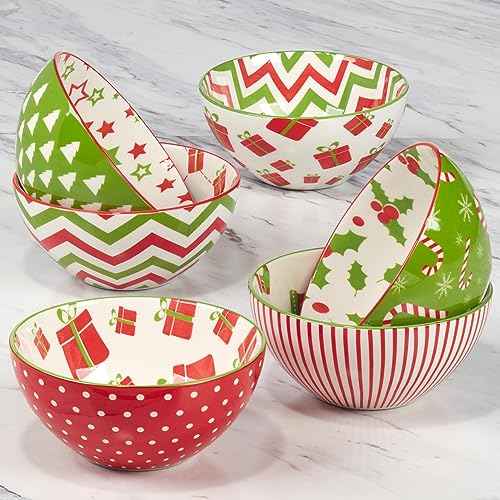 Holiday Fun 13 oz Porcelain Bowls Set of 6 ? Festive Assorted Designs, Chip-Resistant, Dishwasher & Microwave Safe, Durable All-Purpose Holiday Dinnerware for Snacks, Soups, and Desserts.