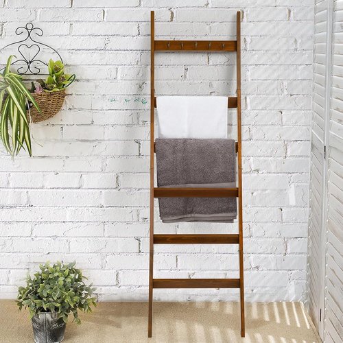 TEAKMAMA 6-Tier Blanket Ladder for Living Room and Bedroom,5.4 Ft Wall Leaning Quilt Rack with Hooks,Rustic Decorative Farmhouse Blanket Storage,Stylish Ladder Holder,Easy to Assemble,Mahogany Finish