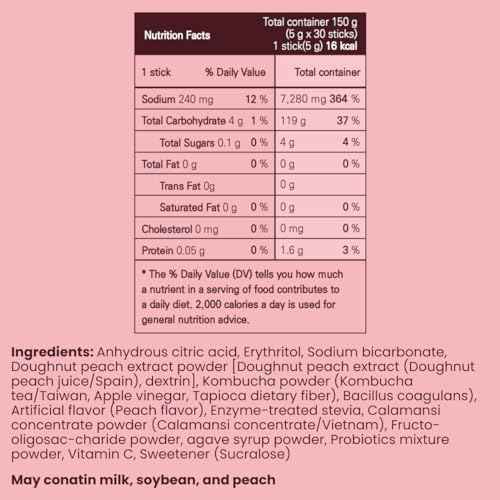 Unha's Everyday Kombucha Tea, Peach Flavored Powder 5g x 30 Sachets (150g/5.29oz) Probiotics, Prebiotics, Sugar-Free, Black Tea, With SCOBY Healthy Drink, Small