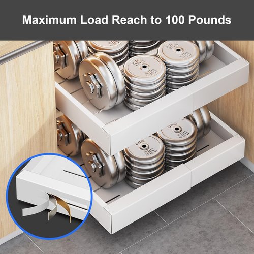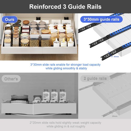 - UPGRADED REINFORCED 3*30MM RAILS: Upgraded from previous 2 sliding rails, our new expadable pull out drawers are made premium-grade metal with precision damping reinforced rail guides, so it never sags in the middle with heavier weight even adjusting to the maximum width limit. Our upgraded version delivers fairly smoothy seamless gliding, which makes it easy to access items at the back of the cabinet without having to reach or bend.