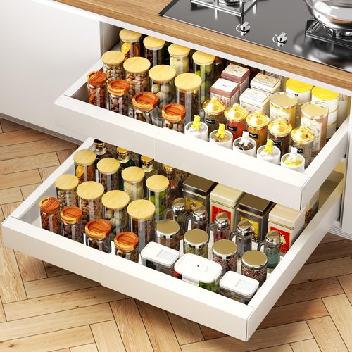 - THREE 18.5" RAILS COMPLETELY SLIDE IN & OUT: All of our three upgraded 30mm widened rails can be smoothly glide out & in for 18.5 inch, which is a must have for a solution to get an easier access of the items that deeper inside the cabinet. And If you already have pull outs on the upper portion and needed to be near the floor to reach into the lower deeper cabinet. This pull out cabinet organizer 21 inch deep will definitely save your knees and back.