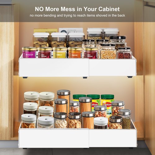 - ADJUSTABLE 11.8" ~ 20.9" WIDTH & 21"DEEP: 2-Pack pull out cabinet organizer 21"deep is made of high quality rustproof carbon steel. With an extendable design, it can be adjusted to fit different kitchen cabinets. Size is 21" depth *3" height, and from 11.8" to 20.9" in width. So you can adjust the slide out drawers width for kitchen cabinets as you need. And our adhesive pull out shelves make it so easy to access everything that was in the cupboards prior to installation.