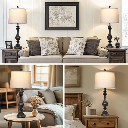 - Farmhouse Table Lamps Set of 2: The black living room lamps are made from resin and metal, come with oatmeal-color linen fabric lampshades(assembly required), featuring unique elegant style. The classic design of the lamp easily complements various interior styles such as simple, rustic and retro. The bedside lamps are perfect for end tables, desks, beside sofas and dressers. It's a great gift choice for your family and friend.