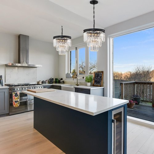 - [Perfect Size]: The size of the kitchen island pendant light is D12 * H14 3/4", perfect size for an kitchen island or dining table, we also recommend you to use multiple lights together for larger space lighting needs. The height could be up to 39.4 inches, you can customize the height as you like, it can be installed on flat or inclined ceilings.