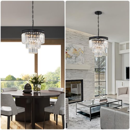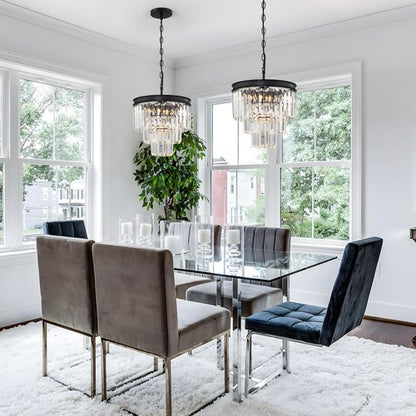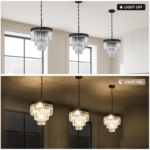 3 Tier Black Crystal Chandeliers, 12 Inch Modern Chandelier Light Fixture, Pendant Lighting Fixtures for Kitchen Island, Vintage Hanging Light for Dining Room Living Room Bedroom Hallway, DD032-3-BK