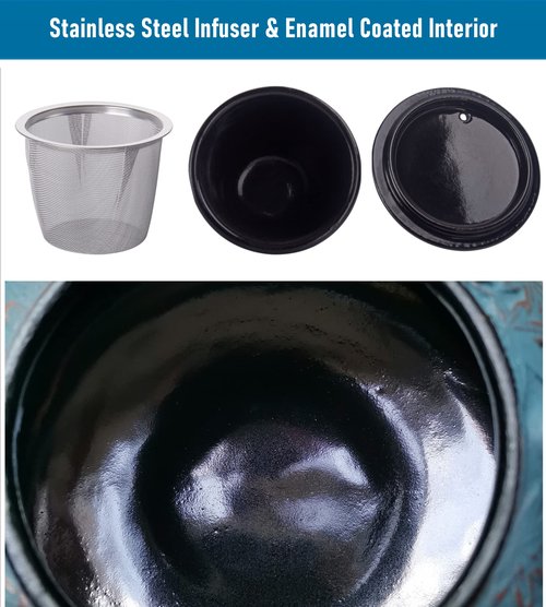 - ENAMEL COATED INTERIOR: The teapot and tea cover, tea cups have an Enamel Coated Interior. No need to worry about rust. Easy clean and keep tea hot for longer.