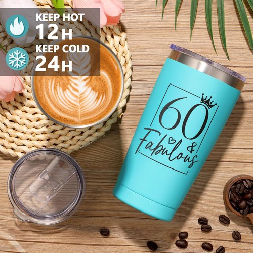 • INSULATED VACUUM TUMBLER: Made of 18/8 food-grade sturdy stainless steel, with double-walled vacuum insulation, this sweat-free insulated 20oz tumbler with lid can preserve beverage temperature up to 24h for cold & 12h for hot, great for iced coffee, wine, juice, champagne, smoothies, sodas, milkshake, etc; "60 & Fabulous" quote print congratulates her 60th birthday & shows your best wishes for her future life, making it an Unique Turning 60 Year Old Gifts for Women 60 and Fabulous Gifts.
