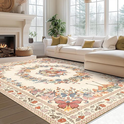 6x9 Washable Butterfly Print Area Rug for Living Room, Soft Low Pile Stain Resistant Beige Large Carpet for Bedroom Nursery Home Decor, Non-Slip & Easy Care Modern Indoor Throw Rug with Rubber Backing