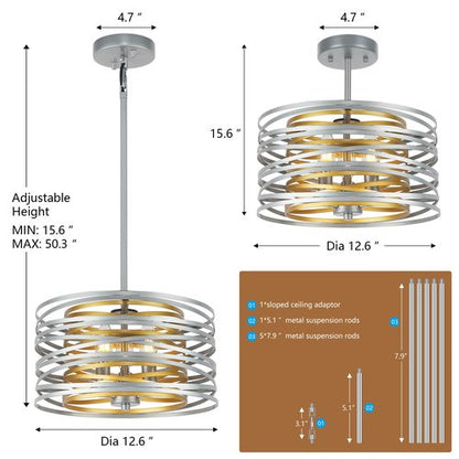 ACNKTZ 12.6'' Drum Pendant Light Fixture Hanging, Retro Semi Flush Mount Chandelier, Silver Chandeliers for Dining Room Bedroom Stairwell Breakfast Area, Silver with Gold Interior