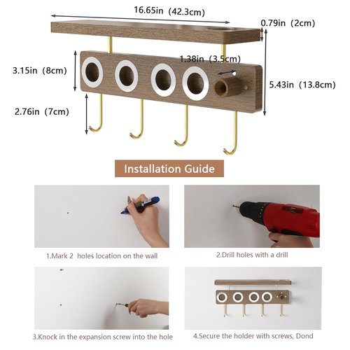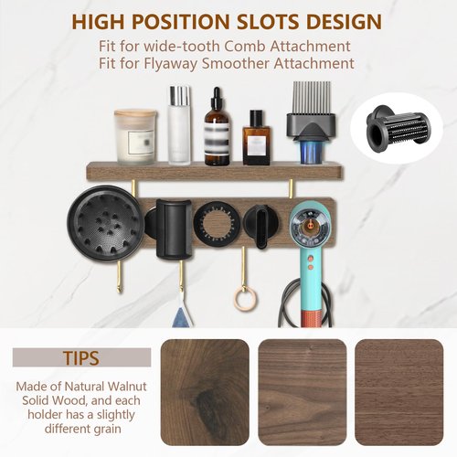 - 【Walnut Hair Dryer Holder with Shelf】Hand polished walnut bar prevents scratches to the hair dryer. Wall mount hair dryer holder made of whole solid walnut wood, each with a slightly different grain, elegant and beautiful. Sturdy and durable, you can use it with confidence as it does not easily deform or corrode even in wet environments.