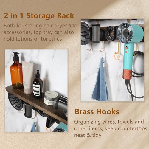- 【Updated 2 in 1 Storage Rack】Both for storing hair dryer and accessories, top tray can also hold lotions or toiletries for easy access, and comes with 4 hooks for organizing power cords, towels and other items. Say goodbye to messy wires, keep it neat and organized, saves space, efficient and organized. Perfect for home, bathroom, barber shops, or salons.