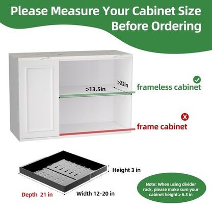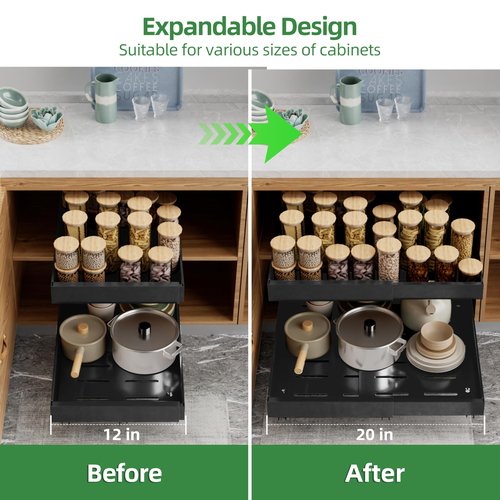 - 【Extendable Design】Our pull out cabinet organizer is made of high quality rustproof carbon steel. Size is 21" depth * 3" height, and from 12" to 20" in width. This extendable design allows for easy adjustment to fit various cabinet sizes.