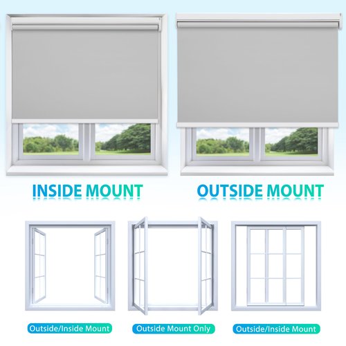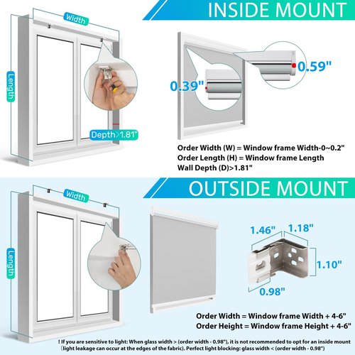 - SELECTION SIZE GUIDE: 1.Inside mount: Window frames need to be at least 2" deep. Blind width needs to be at least 0" to 0.2" less than the window width, and motorized roller shades will have a tiny light gap on each side. If you want 100% Blackout, you can choose outside mount in order to avoid light gap; 2. Outside mount: Shades should be 4" to 6" wider than window frame for better coverage
