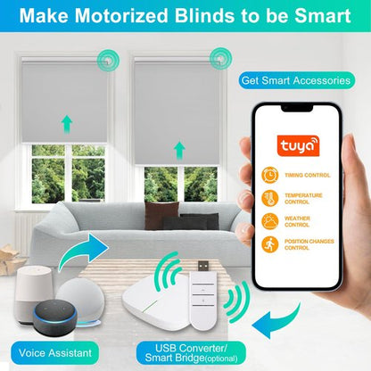 - OPTIONAL SMART ACCESSORIES: We also provide 15-channel remote control B0D7PK3CQK, USB converter B0BVDSX6B3 and smart bridge B0CC22FQX6. The 15-channel remote control can control up to 15 motorized roller blinds, or control one blind individually. With the USB converter, you can control one blind by mobile app or Alexa. With the Smart Bridge, you can control up to 30 blinds by mobile app or Alexa, google assistant. Note: For details, please search for the product code after the product name