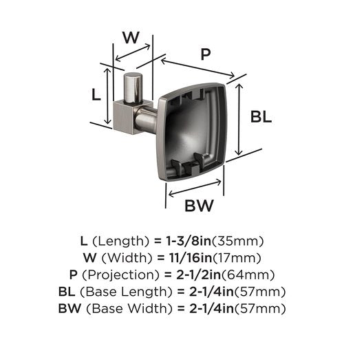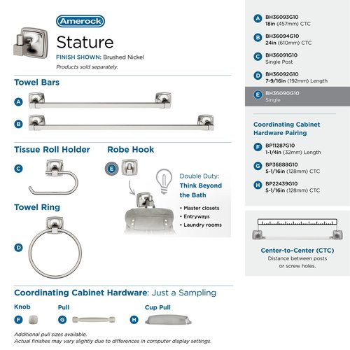 Details: The Amerock BH36090G10 Stature Single Robe Hook is finished in Brushed Nickel. Stately and substantial, the Stature collection’s features classic, bold designs that are underlined with timeless appeal. Enduring and versatile, brushed nickel marries delicate brushing with a subtle warm hue to produce an approachable, classic presentation that resonates across all design styles. Founded in 1928, Amerock’s award-winning home solutions including decorative and functional cabinet hardware, bath accessories, decorative hooks and wall plates have built the company’s reputation for chic design accessories that inspire homeowners to express their personal style. Amerock offers a variety of styles and finishes at affordable prices that add the perfect finishing touch to any room.