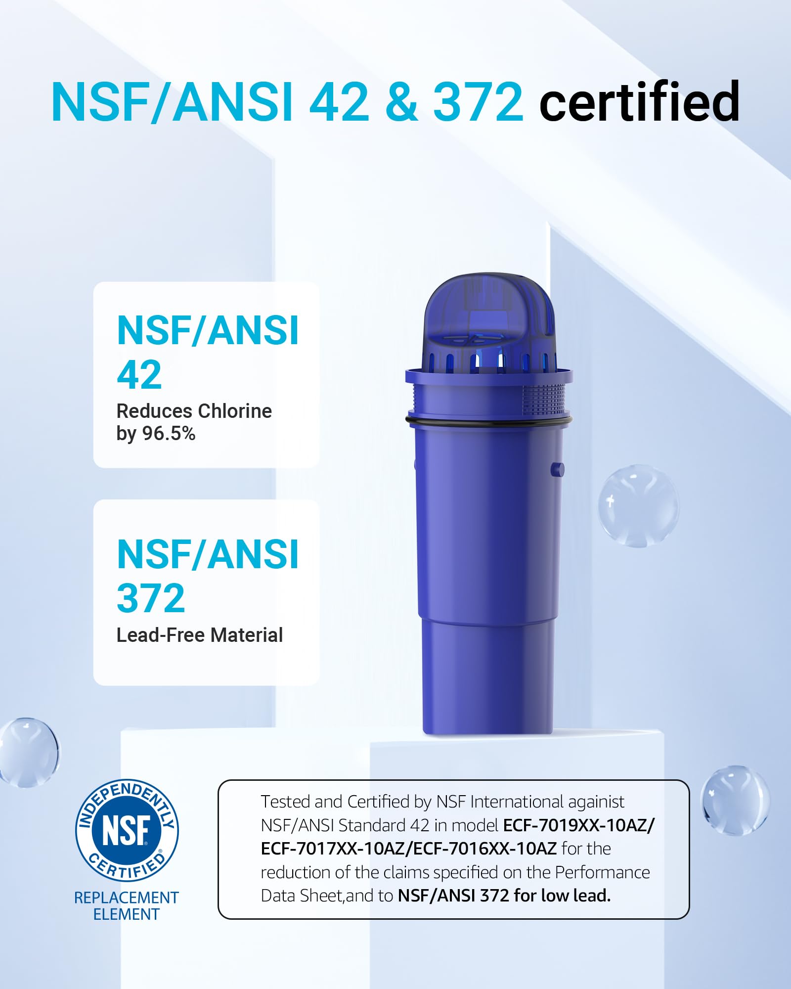 - NSF certified: AQUACREST filter is NSF 372 certified and endorsed as a proficient lead-free material. It has also been certified against NSF 42 standards to ensure absolute reduction of 96.5% of chlorine, bad taste, and odors.