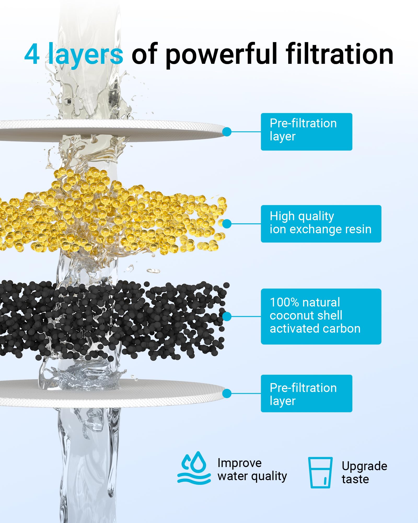 - Multistage filtration: AQUACREST filter is expertly built with multistage filtration technology, using a pre-filter layer with coconut shell activated carbon and high-quality ion-exchange resin to ensure maximum filtration and cleaner water possible.