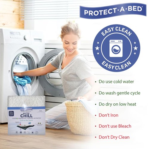 Details: Protect-A-Bed Arctic Chill Mattress Protector is cool to the touch, is just right for hot sleepers, and incredibly comfortable. Utilizing unique fabric technology, Arctic Chill actively transmits heat away from the sleepers throughout the night, leading to fewer hot spots and more comfortable sleeping temperatures. Even through sheets you can feel the cooling power of this mattress protector. keeps your mattress clean and comfortable for a good night. This waterproof mattress pad extends the life of the mattress by blocking accidents, incontinence, perspiration, spills, and stains, yet is air vapor porous to keep you dry and cool.