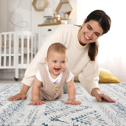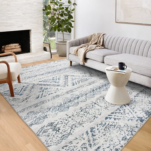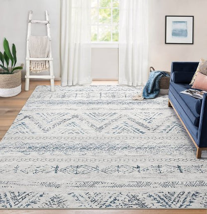 Area Rug Living Room Carpet: 5x7 Large Moroccan Soft Fluffy Geometric Washable Bedroom Rugs Dining Room Home Office Nursery Low Pile Decor Under Kitchen Table Blue/Ivory