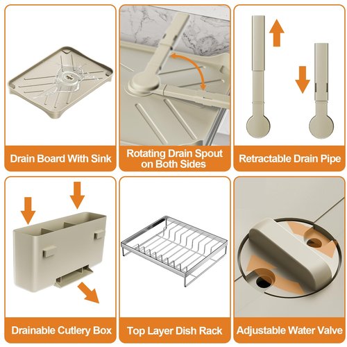 - Automatic Drainage & Non-Wet Countertop: Drying rack for dishes is equipped with hourglass-shaped drainer tray with built-in water channel and 360° rotating retractable dish drains,Adjusts in three directions to quickly drain water into the sink.