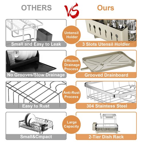 - High Quality & Thoughtful Design: Dish drying rack for kitchen counter is made of 304 stainless steel and is carefully polished to ensure the dish rack with drain is beautiful and high-quality. All corners are rounded and polished to avoid scratches and damage to items.