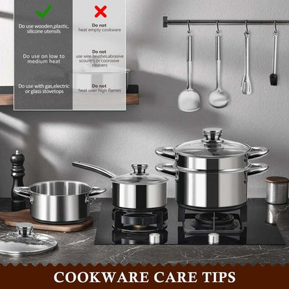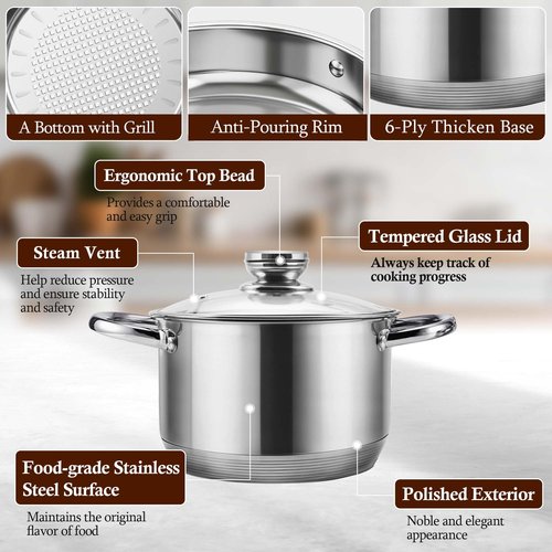 - 【Non-Toxic Cookware】Cooking pot set is made of food-grade stainless steel, rust and corrosion resistance. Stainless steel does not include coating, so 100% free of Teflon, PFOA, PFOS, PTFE, Lead, Cadmium. Ensures that your daily cooking is always safer and healthier