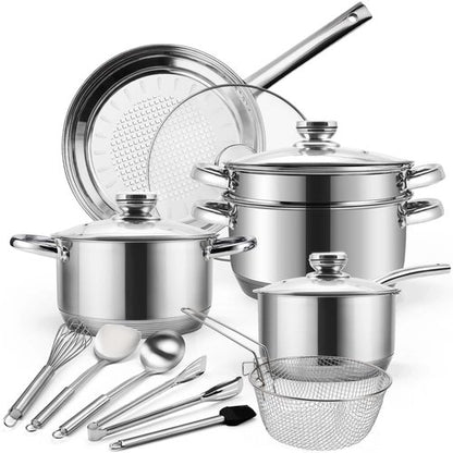 - 【Stainless Steel Pots and Pans Set】15 Pieces Induction Cookware Sets included 3qt saucepan with lid, 4qt stockpot with lid, 6.6qt stockpot with steamer & lid, 9.5inch frying pan with lid, 8inch fry basket and 5pcs kitchen utensils