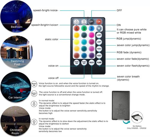 - 【Music Control & Colors Adjust】:The 6W fiber optic lights engine with MUSIC MODE, the 28-key RF remote (NOT include batteries) control the fiber optic strands dancing with the rhythm of music, Adjustable brightness, mode speed and sound sensitivity bringing dynamic atmosphere. RGB lighting modes and adjusts brightness in multiple colors.
