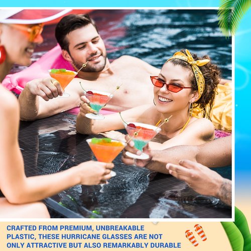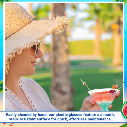 - Quality Material: these cocktail Martini Glasses are made of transparent plastic that is lightweight and durable, resisting breakage; They're perfect for worry-free drinking, thanks to the non toxic safe material; The included gold beaded cocktail picks, made of superior bamboo, are smooth, odorless and good for skewing garnishes or fruits with style