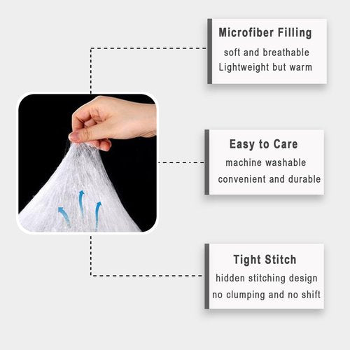 - Premium Filling : Whole piece microfiber filling with tight stylish stitching prevents fill from clumping or shifting;The comforter is fluffy and lightweight ; It will not put downward pressure on your body ;This soft and breathable fabric is good for a comfortable night’s sleep