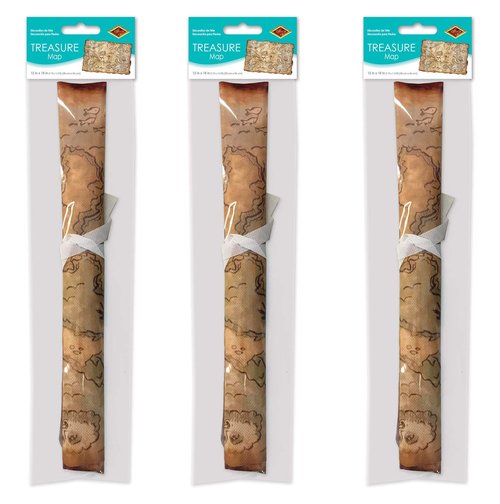 Details: Argh Matey! The 3 piece treasure maps are made to look old for an aunthentic look. They are fun party favors for every guest to receive at a Pirate birthday party. These plastic treasure maps come rolled up and tied. Each map measures 12 inches by 18 inches. Play a party game with them by hiding a treasure somewhere in the room and using these maps for pretend play.
