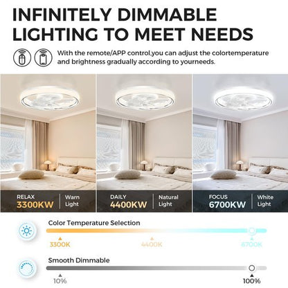 - [3 COLOR TEMPERATURES & STEPLESS DIMMING] - You can easily customize the brightness from 10% to 100% and choose the color temperature from warm (3300K) to white (6700K) via remote control or APP. Whether you need bright light to illuminate your workspace or warm, cozy light to relax, this ceiling fan with light and remote control offers a wide range of options to create the ideal atmosphere. Meanwhile, the memory function allows you to save the function you just set