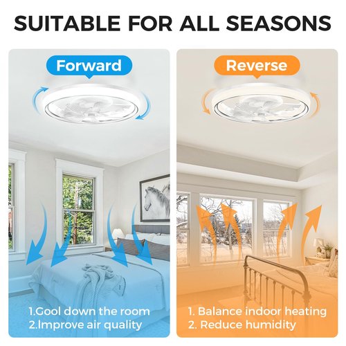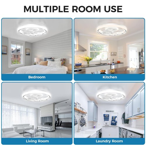 - [EASY INSTALLATION] - The ceiling fan with light features easy installation with most components pre-assembled, reducing the need for a complicated assembly process.7 fan blades, 19 inches in diameter and 6.9 inches in height make the recessed ceiling fan more suitable for rooms of 15-25 square meters. Such as bedroom, kitchen, dining room, bathroom, children's room, living room and office