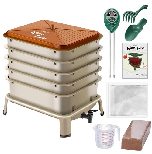 Blütezeit 5-Tray Worm Compost Bin, 53QT Outdoor & Indoor Worm Composter with Worm Farm Starter Kits for Home & Kitchen Recycling Food Waste (Gold)