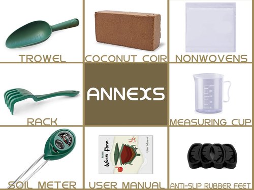 - 🌲【All-in-One Composting Kit】 - Enhance your composting journey with our all-in-one kit, including a Turning Fork, Shovel, Soil Meter, Non-woven Fabric, Coco-coir Brick, Anti-slip Feet, Cup, and Spigot for worm tea. The Soil Meter ensures ideal moisture, pH, and light levels, while our detailed User Manual offers fun and easy step-by-step guidance for success compost. Worms NOT included.