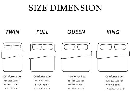 - 【Unique Pattern】This decorative include a comforter and pillowcase.Twin Size (1xcomforter: 68"*86";1x Pillow Case:20"*30"), Full Size (1xcomforter 79"*91"; 2 x Pillow Cases 20"*30" ),Queen Size (1xcomforter 90"*90"; 2xPillow Cases 20"*30" ), King Size (1xcomforter 90"*104";2xPillow Cases 20"*35")