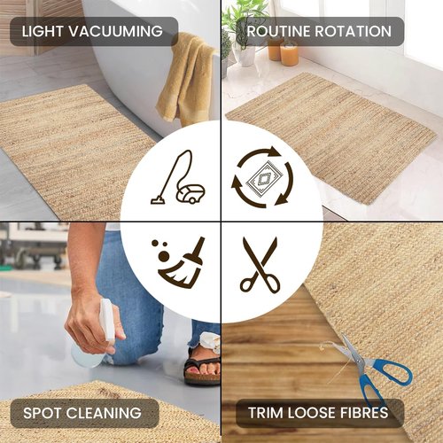 - EASY MAINTENANCE: Caring for your jute rug is simple and hassle-free. Light vacuuming and regular rotation will keep it looking fresh, while spot cleaning with cold water and mild soap helps maintain its natural beauty. This easy care routine ensures your rug remains a beautiful addition to your home for years to come.
