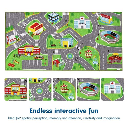 - Motivate your child's curiosity and interest! The traffic road rug for kids provides a fun interactive backdrop for children to host many exciting games. Your little one will like the vivid colors of this theatrical carpet