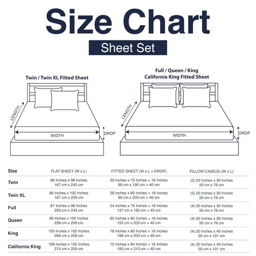 - 6-Piece Cal King Bed Sheet Set: Casual Living Sheet Set contains 1 flat sheet at 108-inch x 102-inch or 274cm x 259cm, 1 fitted sheet at 72-inch x 84-inch or 183cm x 213cm and 4 envelope king pillowcases at 20-inch x 40-inch or 50cm x 101cm.