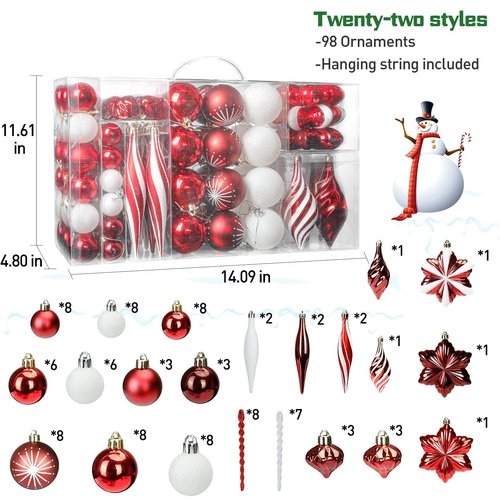 Christmas Ornaments Set, 98pcs Large Shatterproof Christmas Ball Ornaments - Red and White Tree Decorations with Hanging Loop for Holidays, Weddings, Parties