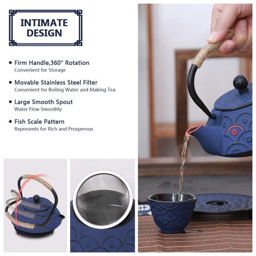 COOGOU Japanese Style Cast Iron Teapot Set with 4 Tea Cups Iron Tea Kettle with Infuser Hemp Rope Trivet Asian Gift for Adults Parents (Fish Scale Pattern, Blue,Anti Rust)