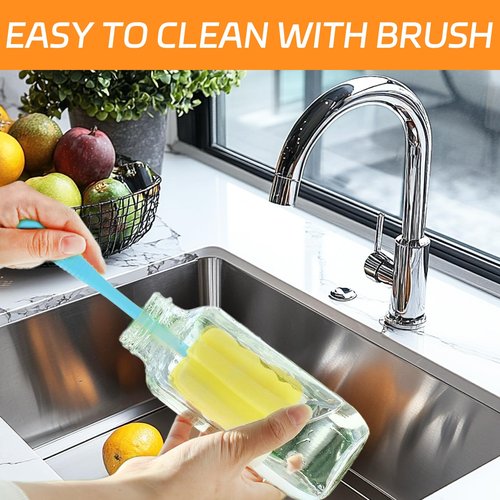 - Easy Use and Clean: Suitable opening size of our glass juicing bottles makes it easy to fill and drink. And they can be easily cleaned with the attached sponge brush. The glass bottle body can be washed in dishwasher, and the plastic lids are recommended to be hand washed