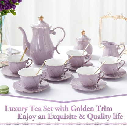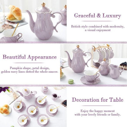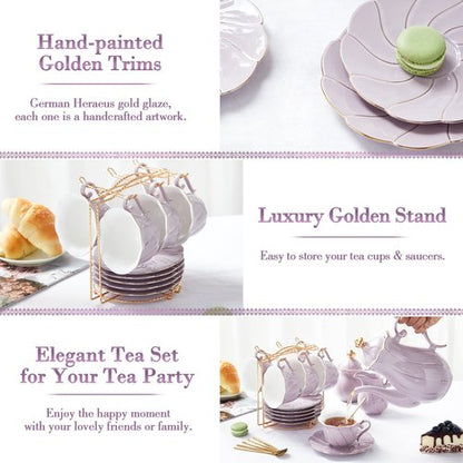 DUJUST 22 pcs Porcelain Tea Set for 6, Luxury British Style Tea/Coffee Cup Set with Golden Trim, Beautiful Tea Set for Women, Tea Party Set, Gift Package (With a Stand) - Purple