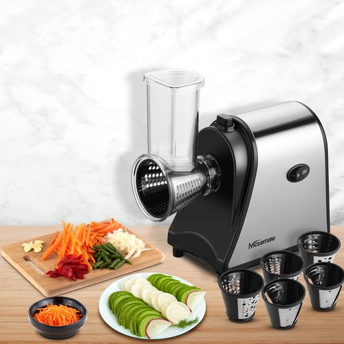 - 5-in-1 Electric Cheese Grater - The electric grater has 5 interchangeable stainless steel blades to meet your different needs. Including thin slicer, thick slicer, fine shredder, coarse shredder, chopped blade, easily to slice or shred vegetables, fruits and to grind cheese.