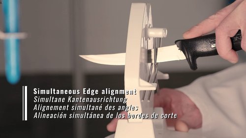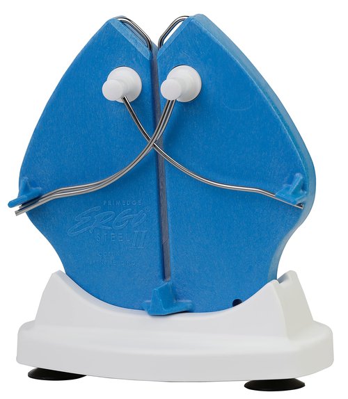 Details: No matter what you are cutting, keeping knife edges sharp is essential. No matter how skilled you are with a knife, all sharp edges will dull. The COZZINIPRIMEdge Ergo Steel II is a fast and easy way to straighten and restore knife edges for razor-sharp performance. The ErgoSteel II is an edge maintenance tool used on the production floor. Throughout the day, as a knife edge dulls, the operator can slide the blade through the unique spring-tensioned rods of the Ergo Steel and sharpen the edge in a matter of seconds. The Ergo Steel II consists of a pair of pivoting hardened stainless steel, tempered rods on a food grade, molded polypropylene base. Under each pivoting rod, fully enclosed spring mechanisms provide perfect sharpened angle and tension between the knife edge and stainless steel rods. Both sides of the edge are straightened simultaneously, assuring a perfect edge in seconds. Requires no special training to use, the Ergo Steel II can be mounted on a table top beside each worker, or can be hand-held with the optional handle for left or right handed operation. Base available for purchase separately.